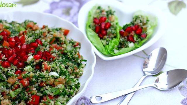 ![]() (1) ستيك لحم الغنم مع التفاح الحار ![]() ![]() 3 كيلو لحم غنم شرائح سميكة ستيك التتبيلة ملح وفلفل 2 ملعقة صغيرة عصير ليمون ملعقة صغيرة بهارات ملعقة صغيرة كاري ملعقة صغيرة جنزبيل مطحون 1/2 حبة فلفل حار مفري ملعقة صغيرة زعتر جاف مطحون ملعقة صغيرة روز ماري أخضر 2 فص ثوم مهروس حبة بصل مفري ناعمًا زيت زيتون للتقديم 2 كوب تفاح بيوريه 3 ملاعق كبيرة سكر أوراق روز ماري أخضر ![]() 1. في وعاء التتبيل ضعي اللحم مع التوابل وقلبي جيدًا، ثم غطي الخليط بكيس بلاستيك واحفظيه بالبراد لليوم التالي. 2. حضري طاسة ساخنة للقلي لايلتصق بها الطعام، وادهنيها بزيت الزيتون ثم ضعي شرائح الستيك واحدة واحدة وهي ساخنة. 3. أتركي كل وجه دقيقتين ثم رصي القطع في صينية فرن ومعها صوص التتبيل. ثم غطي الصينية بورق فويل. 4. أدخليها الفرن الساخن على 180 مئوية لمدة 40 دقيقة واختبري النضج. 5. إنزعي ورق الألومنيوم قبل 10 دقائق من النضج واتركيها لتحمر. أو ضعيها تحت الشواية لمدة دقيقتين مع الملاحظة حتى لايحترق الوجه. 6. قلبي بيوريه التفاح مع السكر على النار حتى يذوب. 7. قدمي ستيك لحم الغنم المحمر مع بيوريه التفاح وأوراق الروز ماري السلطة الخضراء وبالهنا والشفا. ![]() ![]() كيلو بطاطس كبيرة مقطعة حلقات كبيرة مقلية نصف استوا نصف كيلو فطر عيش الغراب (مشروم) 3حبات بصل مقطع بشكل طولي كمية من الداجاج حسب الرغبة مخلية من العظام (مسلوقة) ومقطعة صغير مكعب مرق دجاج ماجي نصف حزمة بقدونس مفروم جبنة موزاريلا ماعقة ثوم مهروس زيت للتحمير فلفل اسود وملح *مقادير الصلصة: كوب قيمر كوب كريما حمراء ملح وفلفل اسود عصرة ليمون ![]() نحضر مقلاة ونضع بها البصل والثوم والزيت ونحمرهم حتى يذبل البصل نضيف مرق الدجاج الماجي والبهارات ونهدئ النار ونضع الدجاج والفطر وقليل من الماء نترك جميع المكونات على نار هادئة جدا حتى يستوي الخليط مع بعضه ثم نضع الخضرة في النهاية ونقوم بتغطية الإناء وفي تلك الاثناء نضع الصلصة بالخلاط ونخلطها نحضر طبق بايركس ونص البطاطس به ثم نضع بعضا من الصلصة ثم نعيد طبقة البطاطس ونسكب باقي الصلصة ونرشها بالجبن ندخلها الفرن من تحت ربع ساعة ونضعها مرة اخرى من فوق لتتحمر ثم تتقدم شوربة المكرونة مع الخضار ![]() ![]() - معكرونة : نصف كوب (صغيرة الحجم) - الجزر : 2 حبة (مقشر ومفروم مكعبات صغيرة) - طماطم : 2 حبة (مقشرة ومفرومة مكعبات صغيرة) - البطاطس : 1 حبة (مقشرة ومفرومة مكعبات صغيرة) - الكوسا : 1 حبة (مفرومة مكعبات صغيرة) - الكرفس : 2 عود (مفروم مع الأوراق) - البصل : 1 حبة (مفروم) - الزبدة : 3 ملاعق كبيرة - ملح : نصف ملعقة صغيرة - فلفل أسود : ربع ملعقة صغيرة - مرق خضار : ليتر (أو مرق دجاج) 1. سخني الزبدة في قدر على نار متوسطة وأضيفي البصل والكرفس وقلبي لمدة 3 دقائق. 2. أضيفي البطاطس والجزر والكوسا وقلبي. 3. أضيفي الطماطم المفرومة والملح والفلفل والمكرونة. 4. أضيفي المرق واتركي المزيج حتى يغلي. 5. خففي النار وغطي القدر واتركيه لمدة 40 دقيقة حتى تنضج الخضار والمكرونة. 6. اسكبي الشوربة في أطباق وقدميها ساخنة إلى جانب الخبز المحمص أو الدجاج حسب الرغبة. ![]() ![]() كينوا - كوب بقدونس مفروم فرماً ناعماً - ربع كوب طماطم مفرومة فرماً ناعماً - 3 بصل مفروم - 3 عروق ليمون حامض معصور - 3 ملح - بحسب الرغبة زيت زيتون - القليل رمان للتزين - بحسب الرغبة ![]() 1- في ضعي الكينوا مع نصف كوب ماء واطبيخها. 2- أتركي الكينوا جانباً بعد الاستواء حتى تبرد تماماً. 3- في وعاء، ضي الكينوا وأضيفي البقدونس والطماطم والبصل. 4- أسكبي الزيت وعصير الليمون الحامض. 5- رشّي الملح بحسب الرغية واخلطي المكونات بروية. 6- زيّني بحبوب الرمان وقدّمي السلطة. طريقة عمل ميلك شيك اللوتس ![]() ![]() - الآيس كريم : كوب (بنكهة الفانيلا) - الزبدة : نصف كوب (اللوتس) - حليب : نصف كوب 1. تخفق جميع المقادير حتى يصبح القوائم كثيف. 2. يصب ميلك شيك اللوتس بأكواب التقديم وتزين بالكريمة وتقدم. ![]() عجينة كنافة - 250 غرام سمن أو زبدة - 3 ملاعق كبيرة حليب مكثّف محلى - فنجان شاي قطر جاهز - 4 ملاعق كبي