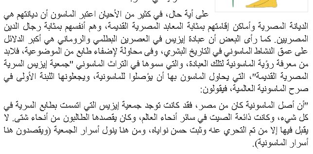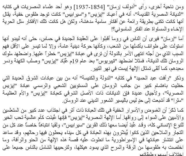 ![]() اليكم مقالة وجدتها في احد المواقع، بعنوان عبادة ايزيس السرية والماسونية لان الماسون يعتبرون الحضارة الفرعونية والهتهم هي مرجعهم، فالعلاقة وطيدة بينهما، للاسف غير ممكن نسخ الكلام، لهذا ساحول بعض الكلام الوارد فيها الى صور اليكم المقتطف الاول كما في الصورة ![]() والمقتطف الثاني كما في الصورة ![]() |