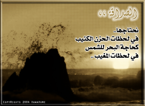 الصـــداقــه الصداقه كلمه قليلة الحروف كثيرة المعاني ليست سلعة تباع وتشترى بل هي لقاء بدون ميعاد وهي اغلي من الذهب ومفاتيحها الحب ومن ينطق بهذه الكلمة عليه ان يعرف معناها الا وهو الإخلاص، التضحية الأساس الصادق الحب المتبادل والفرح والسرور ومن يحافظ عليها فهو بمثابة إنسان غني ليس بالمال ولكن باكتسابه صديق مخلص ألصداقه ورده جميله والجمال منبعها والأمل طريقها لذا يجب علينا ان نتمهل في اختيار الصديق أو عند تغييره لكي نحظى بصديق جاد ومخلص فخيانة الصديق اشد من طعنة السيف فهناك صداقات المصالح وسرعان ما تنتهي بانتهاء المصالح والصداقة التي تحمل في طياتها اسمى المعاني تظل طول العمر فهي شجرة تنمو وتكبر وتترعرع كلما سقيت بماء المحبة والوفاء والإخلاص وليكن شعارنا في الحياة هو الحب والإخلاص