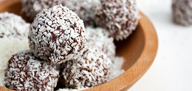 كرات الشوكولاتة بجوز الهند المقادير مغلفين بسكويت سادة (23 بسكوتة في كل مغلف). 3 ملاعق طعام مسحوق الكاكاو. سكر مطحون. كوب جوز الهند ناعم غير محلى. نصف كوب حليب. الطريقة يكسر البسكويت إلى قطع صغيرة جداً. يضاف مسحوق الكاكاو والسكر حسب الطلب ونصف كوب جوز الهند. تخلط جميع المكونات بشكل جيد قبل إضافة الحليب (من الممكن أن نحتاج إلى كمية أكبر من الحليب إذا لم يتماسك الخليط). بعد خلط المكونات نقوم بعمل كرات صغيرة ونغمسها ببقية جوز الهند للتزيين. توضع في الثلاجة إلى حين التقديم. ملاحظة هذه الكمية تكفي لعمل 34 كرة بسكويت الشوكولاتة بجوز الهند. منقول